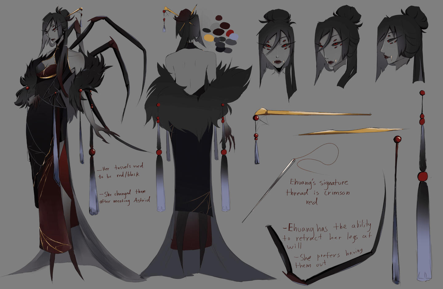 Reference sheets will include two full bodies, front and back. three profiles, front, 3/4, and side. +any extra details such as props, alternative designs, etc.I can make a reference sheet for an existing character or design one for you. I can go off of description but references are preferred.